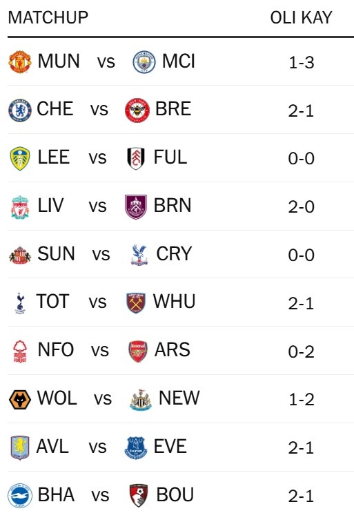 1月16日讯 The Athletic记者Oliver Kay预测本轮英超,该记者预测曼城将3-1击败曼联,切尔西、阿森纳、利物浦赢球。