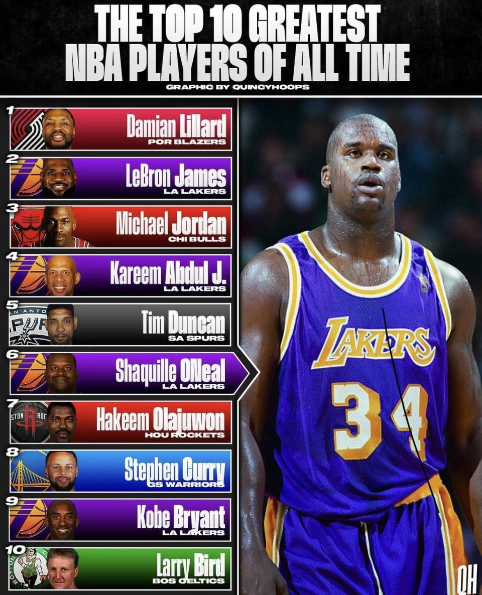 把利拉德排在第一,不仅是挑战篮球常识,简直是在公然“碰瓷”乔丹、詹姆斯和贾巴尔建立的GOAT体系。咱们拿数据说话: