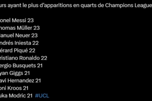 体育资讯4月8日讯 本赛季欧冠1/4决赛即将打响,有媒体统计了在欧冠历史上1/4决赛的球员出场次数。
