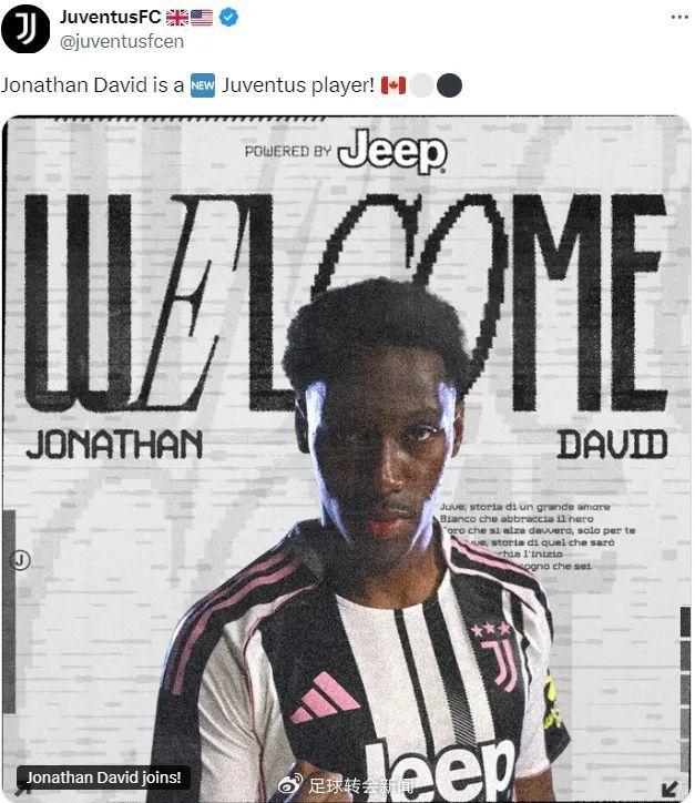 官方:尤文宣布免签乔纳森-戴维,这名25岁的前锋签下了一份5年合同。